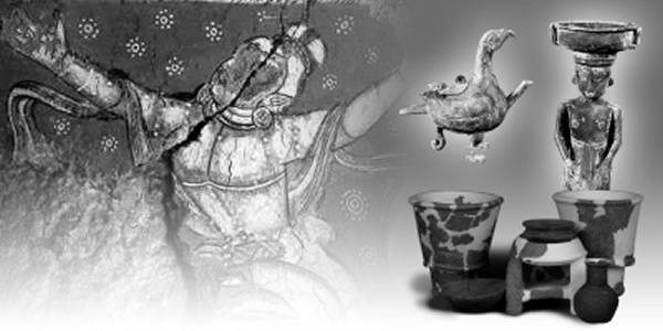 照片为入选2010年“全国十大考古新发现”的考古遗址出土的精美文物拼图,从左至右为新疆吐峪沟佛寺遗址的壁画、山西翼城大河口墓地出土的青铜器等。