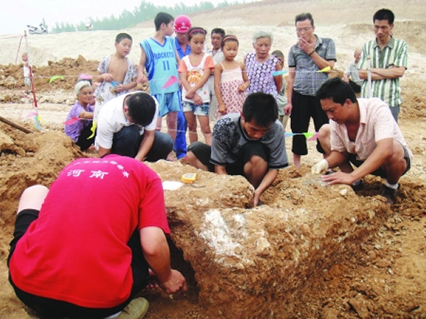 宝丰发现大象化石 来源: 中国化石网 时间:2011年7月22日 10:47 宝丰发现大象化石 宝丰发现大象化石 日前,在宝丰县杨庄镇沃沟村偏南处,文物专家在南水北调工程宝郏段第一标段发现一处生物化石。经鉴定,该化石属于距今约七万年前的大象头骨及象牙化石。 据悉,7月12日,在南水北调工程宝郏段第一标段施工中,工人们挖土时发现一块坚硬的东西。后经宝丰县文物局专家认真观察、研究后,确认这是一块相对完整的大象头部化石。由于长期在湿土中埋藏,化石发酥,轻轻一碰就有白色“骨屑”掉落。 河南日报农村版(丁需学) 上一篇 下一篇 TAG: 大象 化石