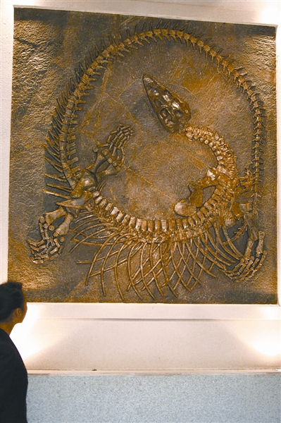 化石展馆3楼一面70平方米的化石墙上,展示了1.4亿年前的狼鳍鱼、东方叶肢介和三尾拟蜉蝣,这3种远古水生生物自然组合在一起的化石,出土于辽宁热河地区,又称“热河三宝”。其中体长约5厘米、宽约0.9厘米,有3条细长尾须的三尾拟蜉蝣,是远古一种典型的水生昆虫。据介绍,其幼虫生活在水中可达五六年,一旦变成成虫出水,就不再吃东西,因此寿命极短,一般只能存活几小时,故有“朝生暮死”之说。因此,蜉蝣化石大部分都是幼虫状态。