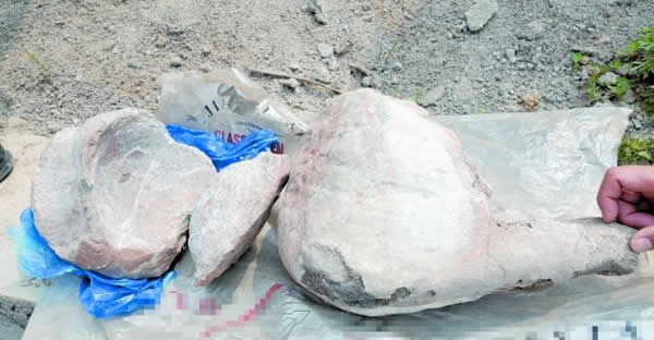 前些日子,尹继发在坤成建材厂工作时,发现了一块质地坚硬且像脊椎骨的一块石头,他想,这块石头的形状和质地都非常特殊,以前干活也从未见过,酷似在电视里看过的恐龙化石,出于好奇他便告诉厂里的陈仁田。没过多久,陈仁田也挖出了两块怪石头,一块形状很像动物的大腿骨、一块尖尖长长的又有点残缺类似动物的牙齿的石头,令厂内的工人惊奇不已又迷惑不解。他们便将情况告诉了村委会。