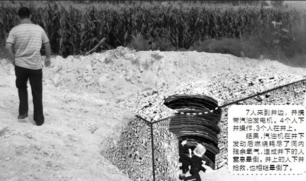 据当地村民介绍,7名死者都是临近的河北村于家湾组的。用当地村民的话说,本村人不会出这样的事的,“因为都知道这个季节危险,再说底下也没东西了。”来到于家湾组的时候,正好其中几户死者家属都在为死者“送盘缠”。记者见到的几位家属都对记者的采访表示了拒绝。该村一名村民透露,7名死者中,于某等4名死者分别是当地于家的儿子和两个姑爷,还有一名20岁左右的年轻人是于家的外甥。其他的焦某等几名死者也分别与几人有着亲属或者朋友关系。“真想不明白他们怎么会去做这个,家里都不缺钱的啊。”当地一名村民很纳闷。 据当地知情人士透露,此次出事的7个人中有3个是当地较有实力的老板,另外4个,1个是工头,3个是采矿的工人,其中包括当年参与过这个矿井开采的工人,对这个矿井的情况比较熟悉,“里面应该还有好东西,3个‘老板’才有重新开采这个矿井的想法。”