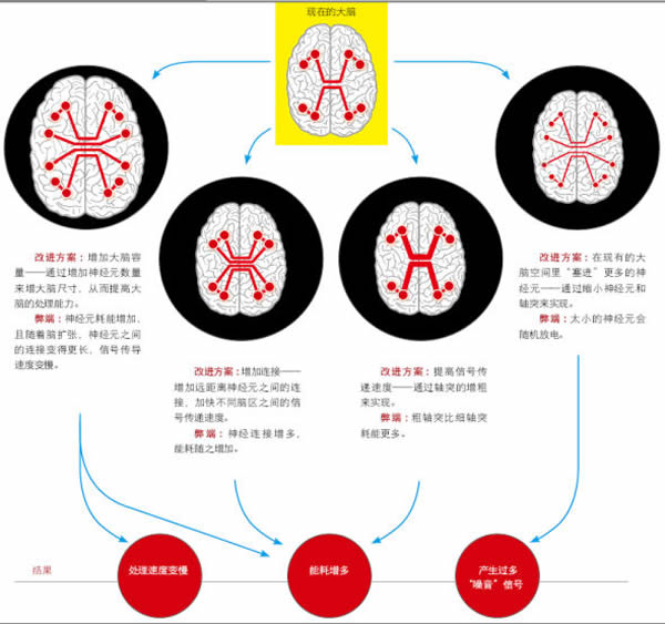 听起来,这像是一个可怕的进化缺陷,但实际上,这是一种折中方案。“如果通道太松,会产生很多‘噪声’,使它会不停地打开或关闭”, 就像先前提到的生物实验那样,拉夫林说, “如果通道太紧,它确实不会产生多少‘噪声’,但这样一来,你得花费更多力气才能打开或关闭它”,也就是说,神经元需要耗费更多能量才能控制离子通道的开关。换言之,神经元使用这种一触即发的离子通道可以节省能量,但副作用是通道的开关不稳定。这又会出现一个利弊问题:只有当你拥有很多离子通道,并通过“投票机制”来决定神经元是否产生电脉冲时,离子通道才是可靠的(即只有当多数离子通道都处于同一状态时,才能决定神经元是否放电)。但是,如果神经元变小,“投票机制”就会出问题。“当你缩小神经元,可产生电信号的离子通道也会减少”,拉夫林说,“‘噪声’则会随之增多。” 在2005 年和2007 年发表的两篇论文中,拉夫林和同事计算了一下,如果要保留足够的离子通道,是否对轴突的最小尺寸会有所限制。结果很令人吃惊。“当轴突直径为150 ~ 200 纳米时,它们就会产生大量的噪音,”劳克林说。在这种情况下,每根轴突上只有少量离子通道,以至于只要一个通道意外打开,就会致使轴突传递一个信号(见第33 页图框),尽管神经元还没有放电的打算。在大脑中,最细的轴突可能发出的噪音信号已经达到每秒6 次,如果再将它们的直径哪怕缩小一点点,它们发出噪音的次数就可能超过每秒100 次。拉夫林指出:“大脑皮层灰质中的那些神经元,它们的轴突的直径,已经非常接近物理极限。”
